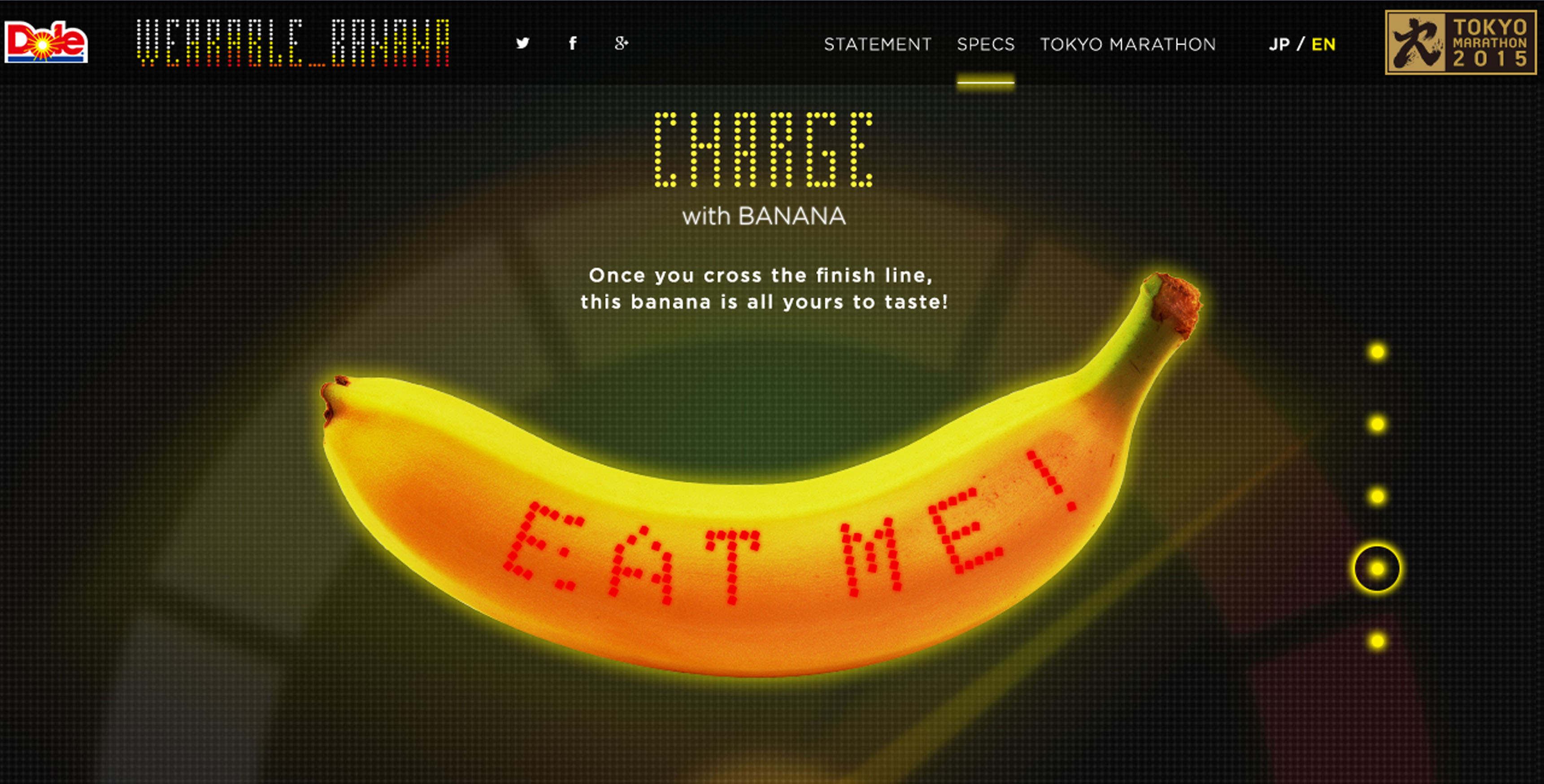 ล่าสุดได้นำผลไม้ที่หาซื้อได้ทั่วไป อย่าง กล้วย มาทำเป็นแวเรเบิล ในงาน โตเกียว มาราธอน ที่ผ่านมาซึ่งมีนักวิ่งเข้าร่วมกว่า 30,000 คน