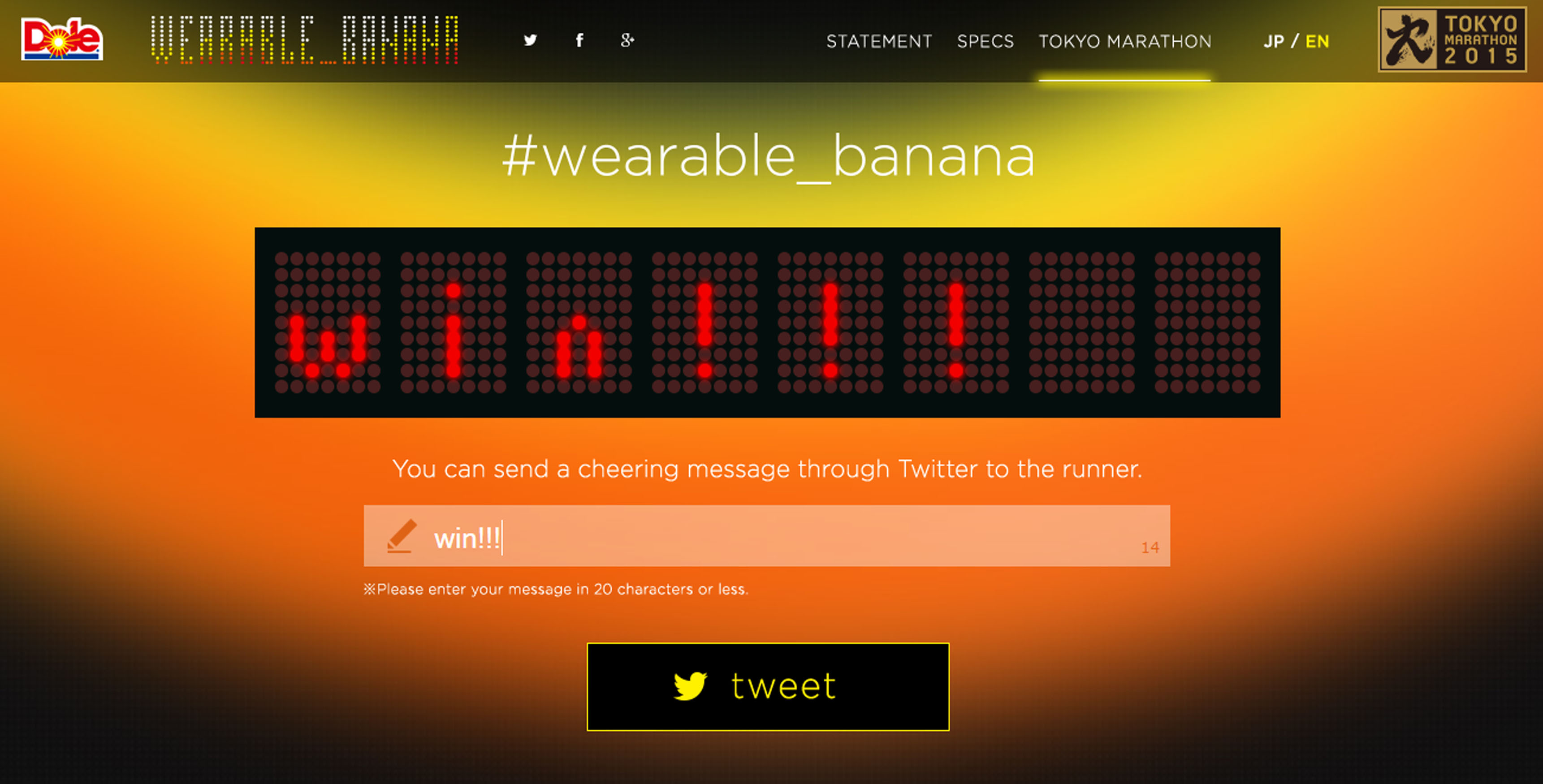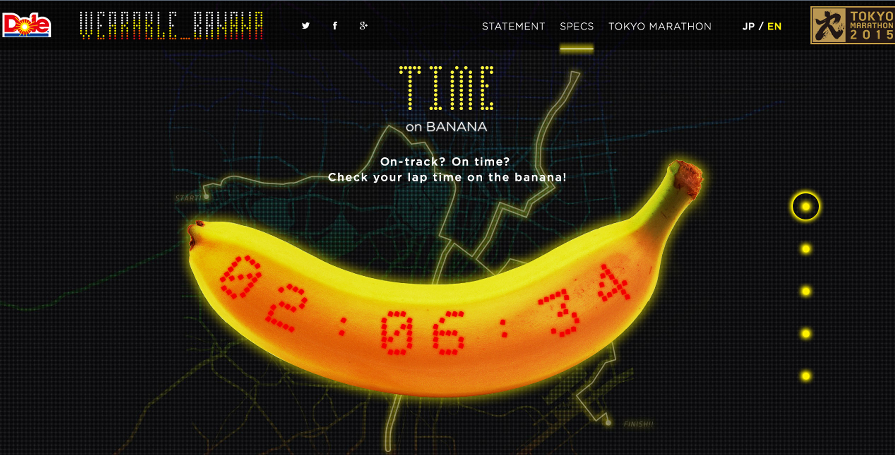 โดล ยังเปิดเว็บไซต์ให้ผู้สนใจเข้าไปอ่านรายละเอียด เกี่ยวกับทั้งกล้วยอัจฉริยะและการแข่งขัน ซึ่งผู้ใช้อินเทอร์เน็ตทั่วโลก สามารถเขียนข้อความในหน้าเว็บไซต์ เพื่อให้กำลังใจนักวิ่ง และข้อความจะไปปรากฏบนหน้าไทม์ไลน์ของทวิตเตอร์ผู้ใช้ และบนผิวกล้วยที่ติดอยู่กับร่างกายนักวิ่ง อย่างไรก็ตาม โดล ไม่ได้แจกจ่ายให้กับนักกีฬาทุกคน มีเพียงนักวิ่งผู้โชคดีเพียง 2 รายเท่านั้น ที่มีสิทธิ์ได้สัมผัสกับแวเรเบิลสุดแปลกนี้