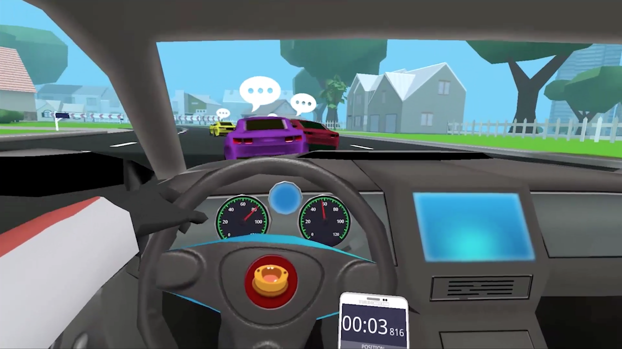 เมื่อเริ่มสตาร์ทเครื่อง ผู้เล่นจะเห็นว่าตัวเองต้องใช้มือเดียวบังคับพวงมาลัย ขณะที่อีกมืออีกข้างกำลังถือสมาร์ทโฟนยี่ห้อซัมซุง เพื่อส่งข้อความ การเลือกโทรศัพท์แบรนด์นี้ไม่ใช่เรื่องบังเอิญแต่อย่างใด เนื่องจากเกมนี้ต้องเล่นกับแว่นตาสามมิติ ซัมซุง เกียร์ วีอาร์ ที่สามารถติดตามความเคลื่อนไหวของศีรษะเมื่อก้มลงส่งตอบข้อความของเพื่อนในแชท ด้วยคีย์บอร์ดเสมือน