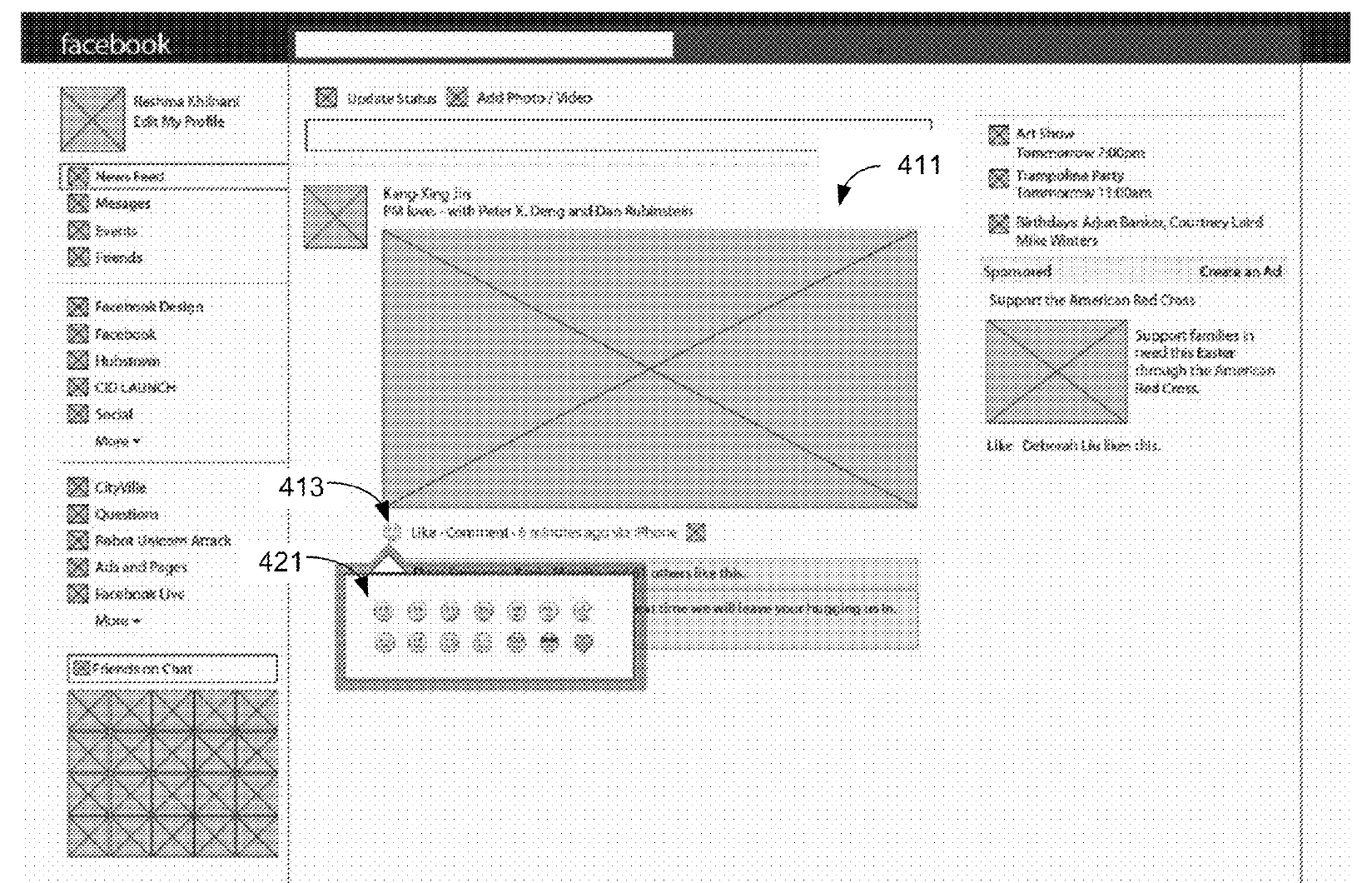 สิทธิบัตรนี้ Facebook ขอจดไว้ตั้งแต่ปี 2013 แต่เพิ่งได้รับการอนุมัติเมื่อเดือนธันวาคมปี 2014 ซึ่งสิทธิบัตรนี้แสดงให้เห็นว่าอกจากปุ่มไลค์แล้ว ผู้ใช้ยังสามารถแสดงอารมณ์ในรูปแบบอื่นๆ ด้วยการเลือกอีโมจิที่ตรงกับความรู้สึกในขณะนั้น คล้ายๆกับการเลือกอีโมจิในไอโฟน