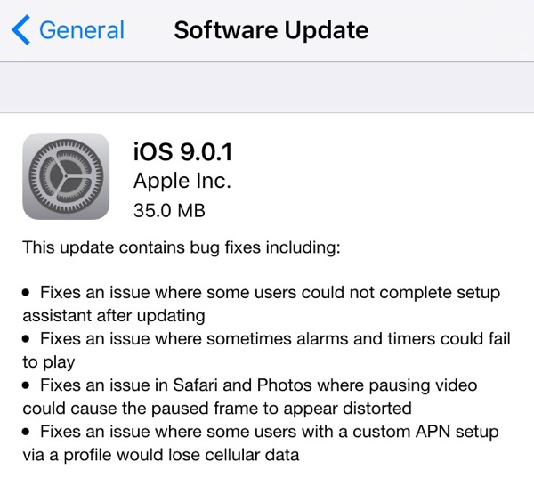 เพียงแค่ 1 อาทิตย์กว่าหลังจากที่ iOS 9 ได้เปิดให้ผู้ใช้อุปกรณ์ iOS ได้อัพเดทไปเมื่อวันที่ 16 กันยายนที่ผ่านมา ทาง Apple ได้ปล่อย iOS 9.0.1 ซึ่งมีการอัพเดทเพิ่มเติมเล็กน้อยจาก iOS 9 รวมถึงการแก้ไขบั๊กต่างๆที่เจอ อย่างทันใจ ไม่ปล่อยให้ผู้ใช้รอนาน