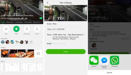 ที่สะดวกกว่านั้นคือ ใช้นัดทานข้าวกับเพื่อนที่ร้านโปรดได้ง่ายๆ แค่สร้างการนัดหมาย เลือกร้าน ใส่วันเวลานัดหมาย จากนั้นส่งนัดให้เพื่อนผ่าน Facebook, Whatsapp หรือ WeChat