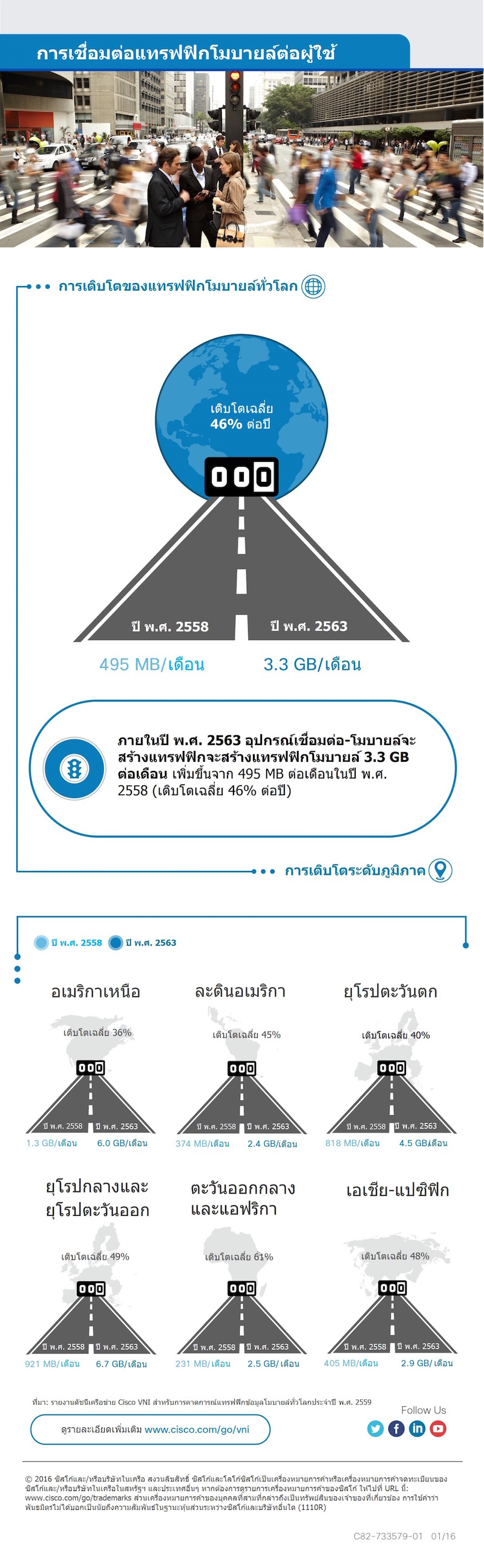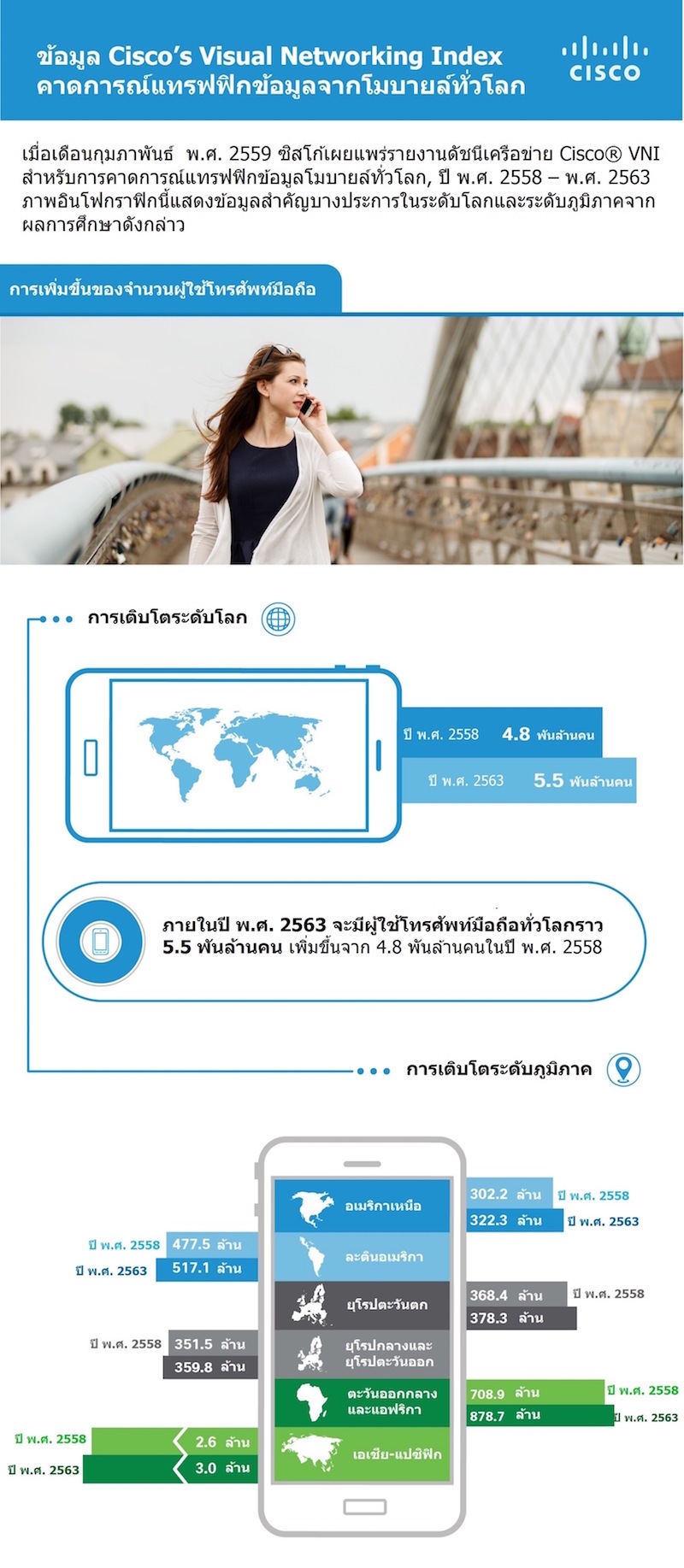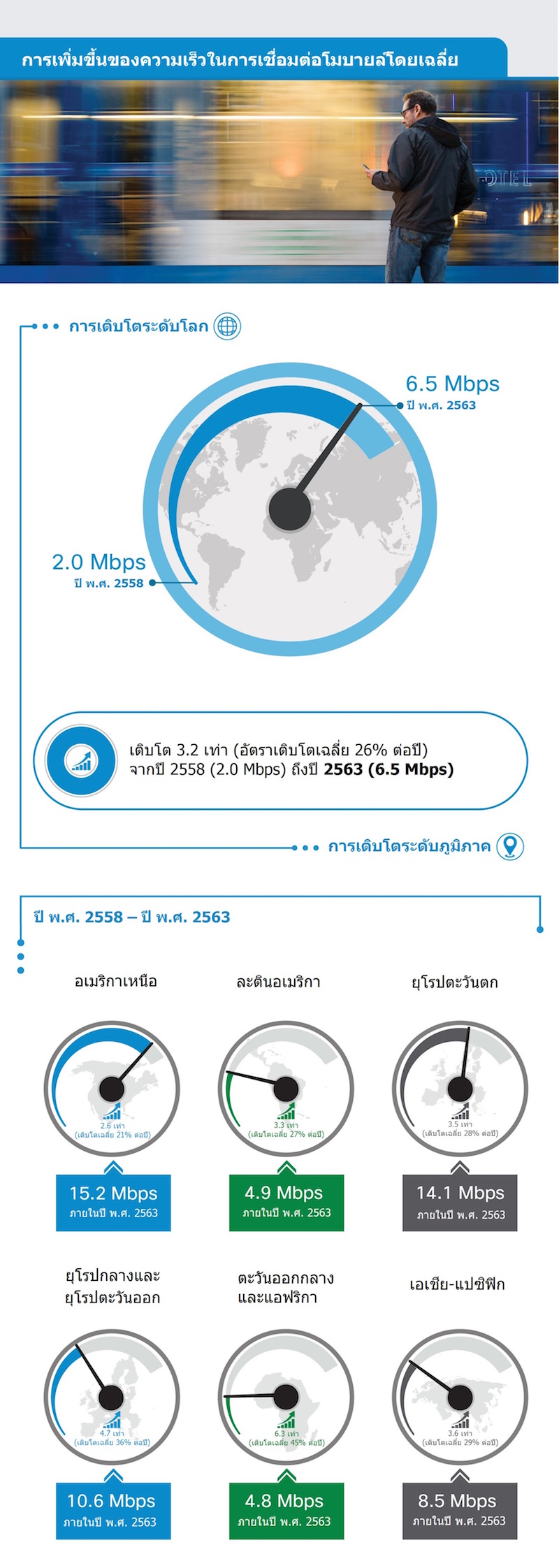• ในปี พ.ศ. 2558 ถึง พ.ศ. 2563 แทรฟฟิกข้อมูลโมบายล์ทั่วโลกจะเพิ่มขึ้นในอัตราที่รวดเร็วกว่าแทรฟฟิกไอพีบนเครือข่ายพื้นฐานทั่วโลกถึง 2 เท่า