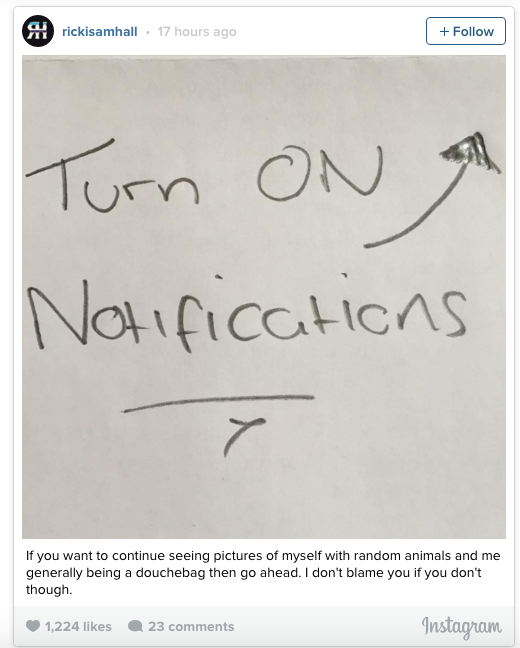 การเปลี่ยนแปลงครั้งนี้ทำให้เหล่าคนที่มีชื่อเสียงรวมถึงแบรนด์ต่างๆที่ทำการตลาดบน Instagram นั้นต้องออกมามาโพสต์เชิญชวนให้ผู้ติดตามนั้นเปิดฟีเจอร์ “turn on push notifications” เพื่อแจ้งเตือนเมื่อ account นั้นๆมีการโพสต์รูปใหม่ๆ ในไทยคาดว่าเราน่าจะได้เห็นคนดังออกมาโพสต์โปรโมทเร็วๆนี้แน่นอน