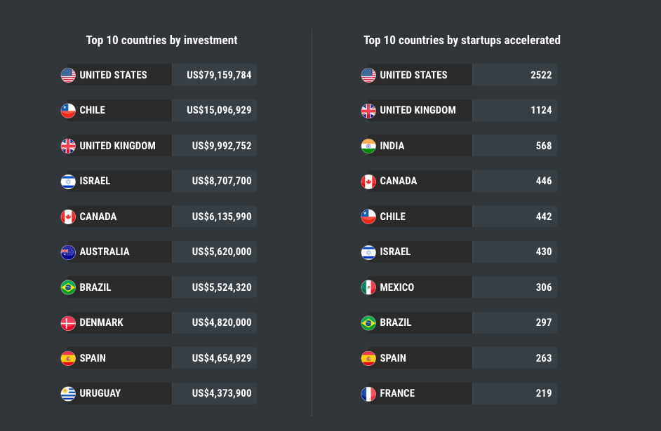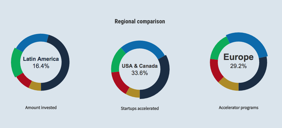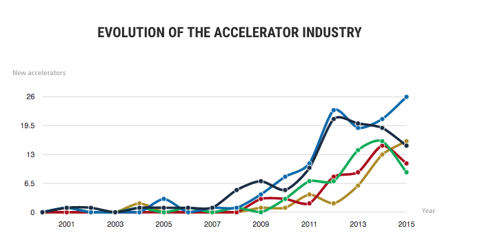 อเมริกาและแคนาดาถือเป็นผู้นำของการเปิดตัว accelerator program โดยขึ้นไปสูงสุดในปี 2012 จากนั้นก็เริ่มตกลง ในขณะที่บางทวีปถึงจุดพีคในปี 2014/2015