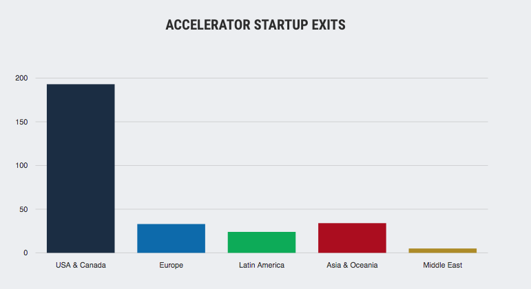 จากข้อมูลด้านบน แสดงให้เห็นถึงการ exits ด้วยการควบรวม/ซื้อกิจการ, การเข้าตลาดหุ้นระหว่างมกราคม 2015 – ธันวาคม 2015 จะเห็นได้ว่าอเมริกาโตสุด ส่วนทวีปอื่นๆยังถือว่าน้อย นั่นจึงเป็นเหตุผลว่าทำไม Accelerators ถึงต้องเปลี่ยนและกระจายความเสี่ยงโมเดลธุรกิจ