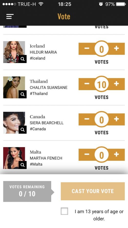 4.เมื่อเข้ามาหน้าVote จะเจอกับสาวงามมากมายเราไม่ต้องสนใจค่ะ เลื่อนมาด้านล่างตรงThailand จากนั้นกดบวก10 ไปเลยค่ะ เสร็จแล้วติ๊กเครื่องหมายถูกตรงคำว่า i am 13 years of age or older. จากนั้นกด” CAST YOUR VOTE ” เลยค่ะ เป็นอันเรียบร้อย