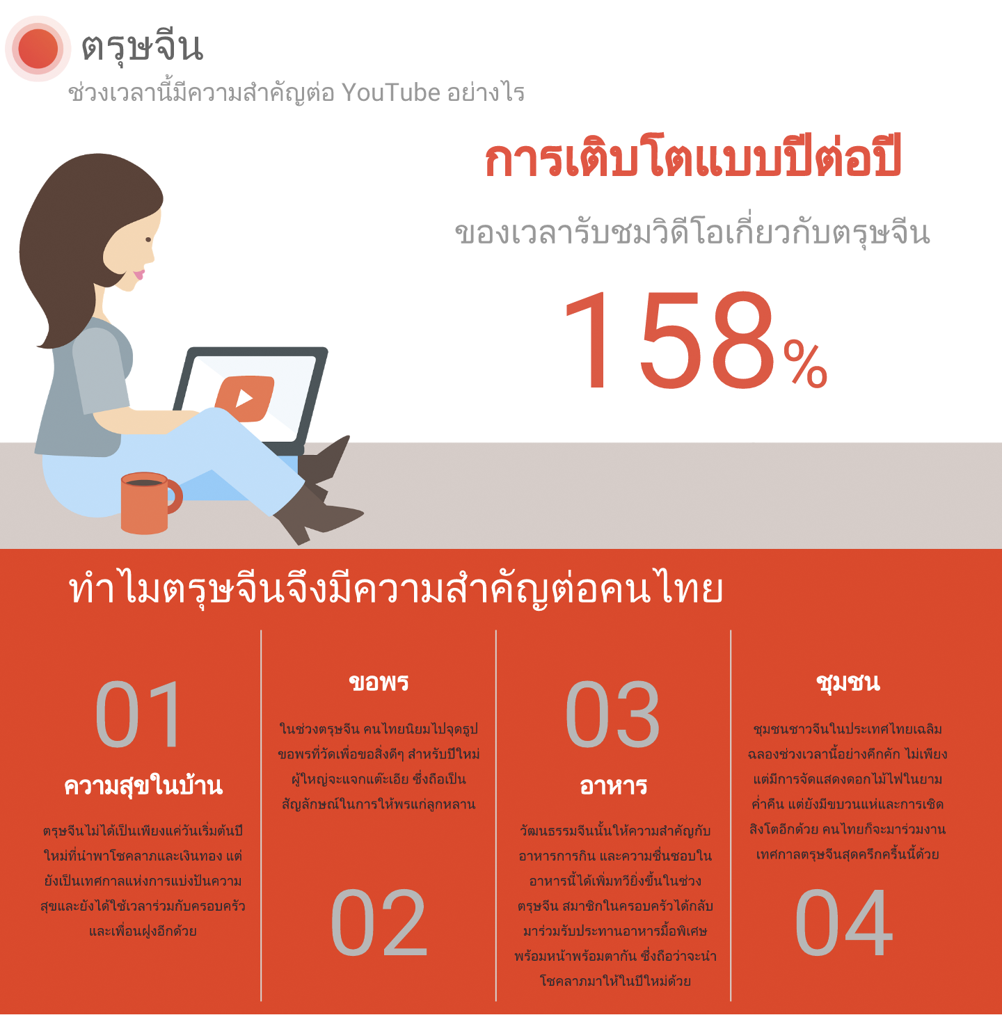 Google เผยข้อมูลการชมวิดีโอบน Youtube ของคนไทยช่วงเทศกาลตรุษจีน เพิ่มสูงขึ้นถึง 158% เมื่อเทียบปีต่อปีกับพ.ศ. 2559 แล้วคุณอยากรู้มั้ยว่าคนไทยดูอะไรกัน