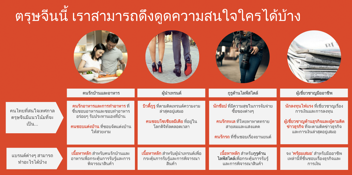 เทศกาลตรุษจีนคือช่วงเวลาสำคัญที่แสดงให้เห็นความหลากหลายของผู้บริโภคบน YouTube เริ่มจากคนรักบ้านและอาหาร จนถึงผู้นำเทรนด์ต่างๆ รวมทั้งกูรูด้านไลฟ์สไตล์และผู้เชี่ยวชาญมืออาชีพ แบรนด์ต่างมองหาแนวทางการสร้างสรรค์แคมเปญการตลาดที่มีความสดใหม่ในปี 2560 เพื่อ