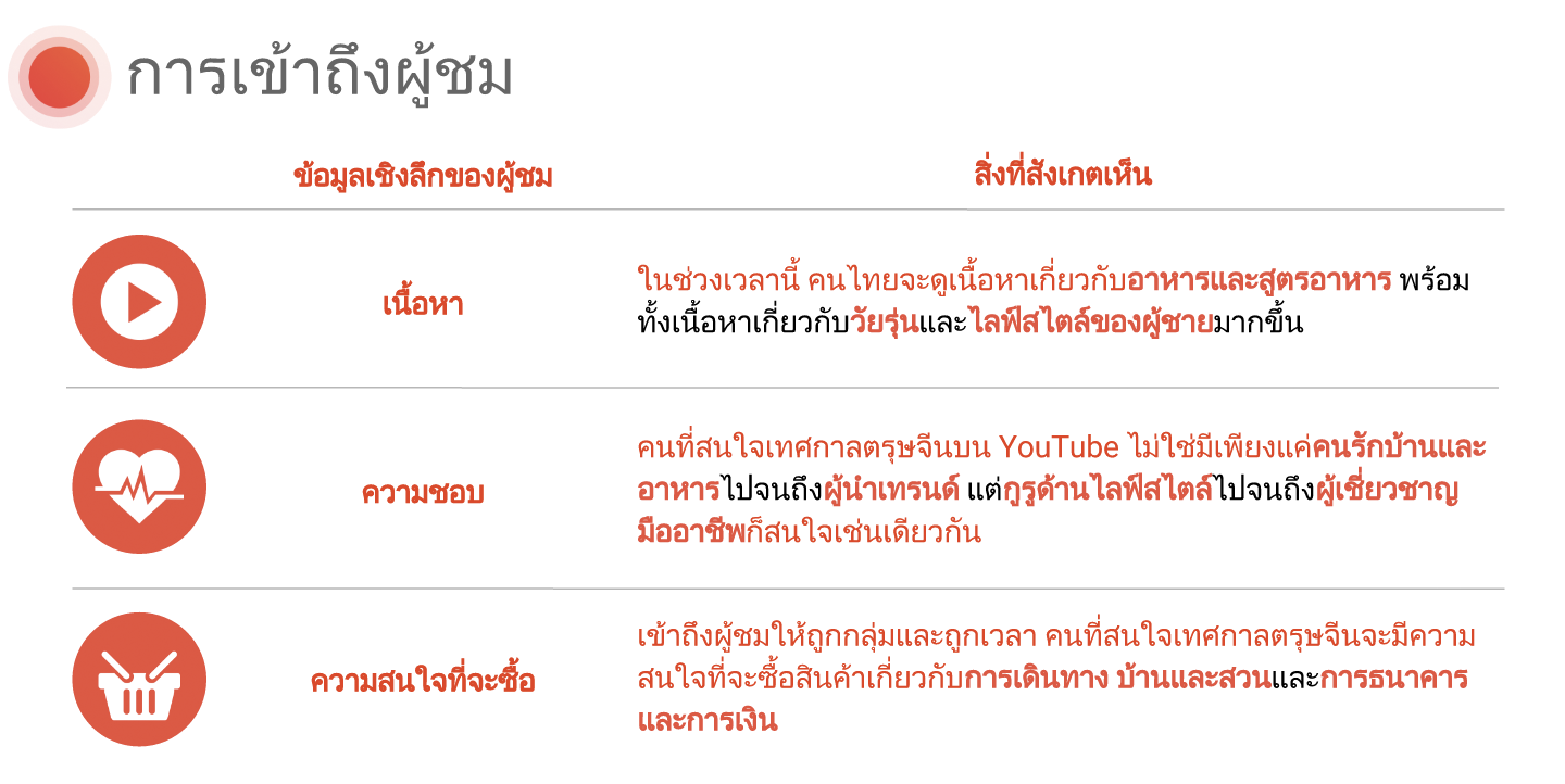 เข้าถึงกลุ่มเป้าหมาย ซึ่งควรพิจารณาและค้นหาเครื่องมือต่างๆ บน YouTube ที่เหมาะสมกับพวกเขา ไม่ว่าจะเป็นเวลาหรือที่ไหนก็ตามที่พวกเขากำลังรับชมวิดีโอ จากโฆษณาใน 6 วินาทีแรก (Bumper ads) ที่สร้างความดึงดูด ไปสู่โฆษณาด้านบนหน้าแรกของ YouTube (Mastheads) และรูปแบบการโฆษณาที่กดข้ามไม่ได้ (TrueView) เพื่อดึงดูดความสนใจต่อเนื่องในระยะเวลายาว การจับคู่เนื้อหาที่อยู่ในความสนใจของผู้บริโภคและใช้ช่องทางการสื่อสารที่ถูกต้องจะกลายเป็นไอเดียที่ยอดเยี่ยมในตรุษจีน หรือในช่วงเวลาสำคัญอื่นๆ ในปีนี้
