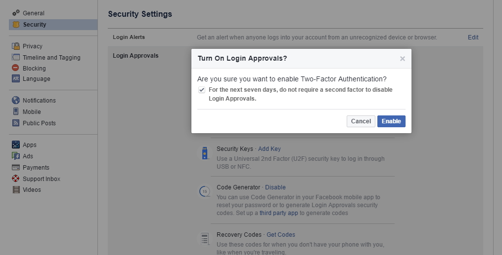 ให้เข้าไปที่ Setting (การตั้งค่า) > Security (ความปลอดภัย) > Login Approvals (การยืนยันเข้าสู่ระบบ) จะอยู่หัวข้อแรกให้เปิดใช้งาน หรือ Enable หรือ เปิดใช้งาน