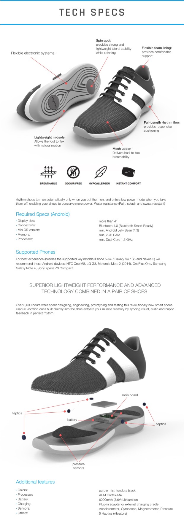 โดยรองเท้าคู่นี้จะติดตั้งเซนเซอร์ทั้ง accelerometer, gyroscope, magnetometer เพื่อเชื่อมต่อกับ Smart phone แสดงการก้าวของคุณน้ำหนัก ความเร็ว เพื่อเป็นการบอกว่าคุณเต้นเป็นอย่างไร รวมถึงมีการสอดเรื่องการเต้นในโปรแกรมตัวนี้