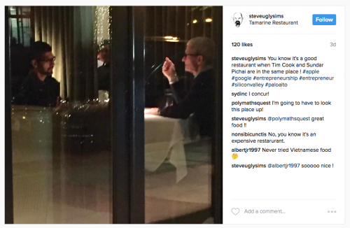 แต่ล่าสุดดูเหมือนว่าความสัมพันธ์ของทั้งสองบริษัทนั้นอาจจะกลับมาดีเหมือนเดิมอีกครั้ง เมื่อมีคนตาดีไปแชะภาพ Tim Cook นั่งทานข้าวกับ Sundar Pichai ผู้บริหารของกูเกิล ที่ Tamarine Restaurant ร้านอาหารเวียดนามชื่อดังในย่าน Palo Alto ของ Silicon Valley จากรูปดูเหมือนว่าทั้งคู่จะดื่มไวน์กัน