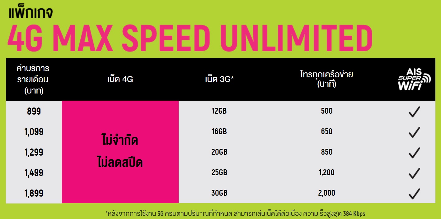Package 4G Max Speed Unlimited ซึ่งจะเริ่มต้นที่ราคา 899 บาทสามารถต่อ 4G ได้ไม่จำกัด แต่ว่าข้อเสียคือถ้าเกิดไม่ได้เชื่อมต่อ 4G อินเทอร์เน็ตก็ลงมาจำกัดอยู่ดีตาม Package ที่เราเลือก และค่าโทรยังคงจำกัดอยู่ ซึ่งน่าเสียดาย
