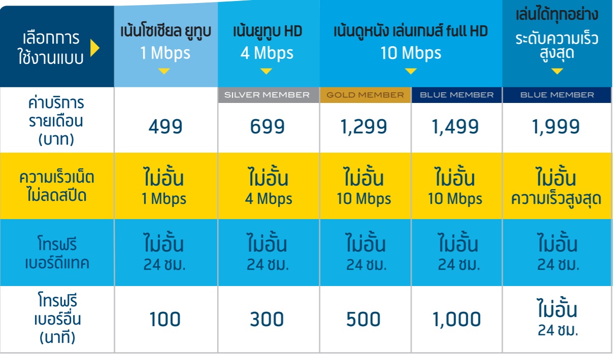 กับ Package Go No Limit ซึ่งมีให้เลือกหลากหลายราคาตั้งแต่ 499, 699, 1299, 1499 และ 1,999 ซึ่งตัวแพงที่สุดคุณจะไม่ถูกจำกัดในเรื่องความเร็วอินเทอร์เน็ต และทุก Package นั้นยังสามารถโทรหากันในเครือข่ายฟรี ยกเว้นตัวแพงสุดที่จะโทรหาเครือข่ายไหนก็ได้ เรียกได้ว่าคุ้มไปอีกแบบแต่ก็แลกกับการจ่ายแพงล่ะนะ