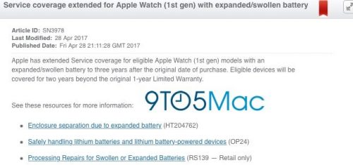 หลังจากที่มีผู้ใช้ Apple Watch รุ่นแรกรายงานเข้ามาใน Forum ออนไลน์มากขึ้น ว่าแบตเตอรี่มีอาการบวมหรือปูด จนดันหน้าจอขึ้นมาให้เผยอขึ้น ซึ่งทางแอปเปิ้ลตรวจสอบแล้วว่ามีปัญหาจริง  จึงได้ทำการประกาศผ่านหน้าออนไลน์ขยายการรับประกับแบตเตอรี่ปูดสำหรับนาฬิกาอัจฉริยะรุ่นแรกเป็นเวลา 3 ปี