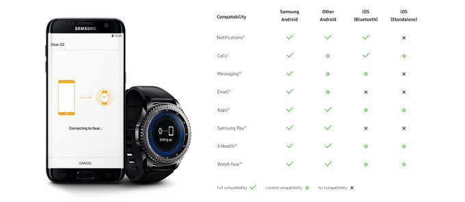 หลังจากที่ Samsung ได้เปิดตัว Gear S3 พร้อมกับมีการปล่อยให้ Samsung Gear Application สามารถใช้งานกับ iOS แล้วตอนนี้ Samsung ได้เผยตาราความสามารถเมื่อใช้งานแต่ละ OS ในตัว Gear S3