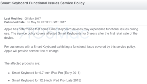 Apple ได้ขยายเวลา repair program ของ Smart Keyboard ที่ใช้งานกับ iPad Pro ส่งผลให้เวลารับประกันของSmart Keyboard เพิ่มขึ้นรวมเป็น 3 ปีนับตั้งแต่วันแรกที่ซื้อสินค้ามา โดยแอปเปิ้ลได้ส่งเอกสารเมโมภายในให้กับพนักงานในร้านและตัวแทนจำหน่ายต่างๆ เพื่อให้รับทราบเกี่ยวกับนโยบายใหม่ ซึ่งทางเว็บ 9to5Mac ได้รับเอกสารนี้มาจากแหล่งข่าว