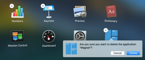 หลายแอปที่คุณใช้งาน ส่วนหนึ่งจะโหลดมาจาก App Store วิธีลบแอปเหล่านี้ที่ง่ายและเร็วที่สุดคือให้เปิด Launchpad ที่เป็นไอคอนรูปจรวดบน Dock จะกดคีย์ลัด F4 เรียกเปิดก็ได้ จากนั้นมองหาแอปที่ต้องการลบ จากนั้นก็ลากเม้าส์ไปจิ้ม กดค้างไว้จนไอคอนสั่นแบบเดียวกับการลบแอปบนไอโฟน เสร็จแล้วเราจะเห็นไอคอนรูปกากบาทตรงมุมขวาบน เมื่อกดแล้วจะมีหน้าต่างขึ้นมาเพื่อยืนยันการกดลบกดลบ