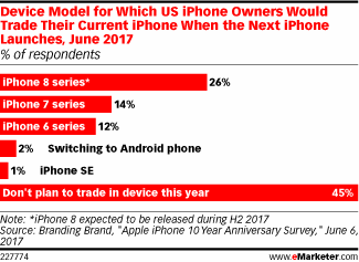 พบว่า 45% นั้นไม่เปลี่ยนของใหม่ในปีนี้ แต่ว่าอันดับที่ 2 ที่ตามมาติด ๆ พบว่าคนรอซื้อ iPhone 8 กว่า 26% นอกจากนี้ยังมีการเผยอีกว่า การใช้งานของ iPhone ส่วนใหญ่คนนำไปโทรกันมากถึง 65%, ในด้านการฟังเพลงและวีดีโอสูงถึง 60% ส่วน 58% บอกว่านำไปเล่นอินเทอร์เน็ตนั้นเอง