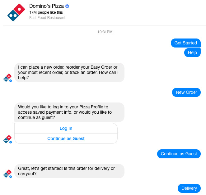 สำหรับในต่างประเทศคุณสามารถสั่ง Domino Pizza จาก Facebook Messenger โดยถ้ากดแล้วจะมีการสั่งอาหารเข้าไปยัง Inbox และสามารถส่งแผนที่ได้โดยตรงและชำระเงินได้ทันที ถือว่าสะดวกมาก