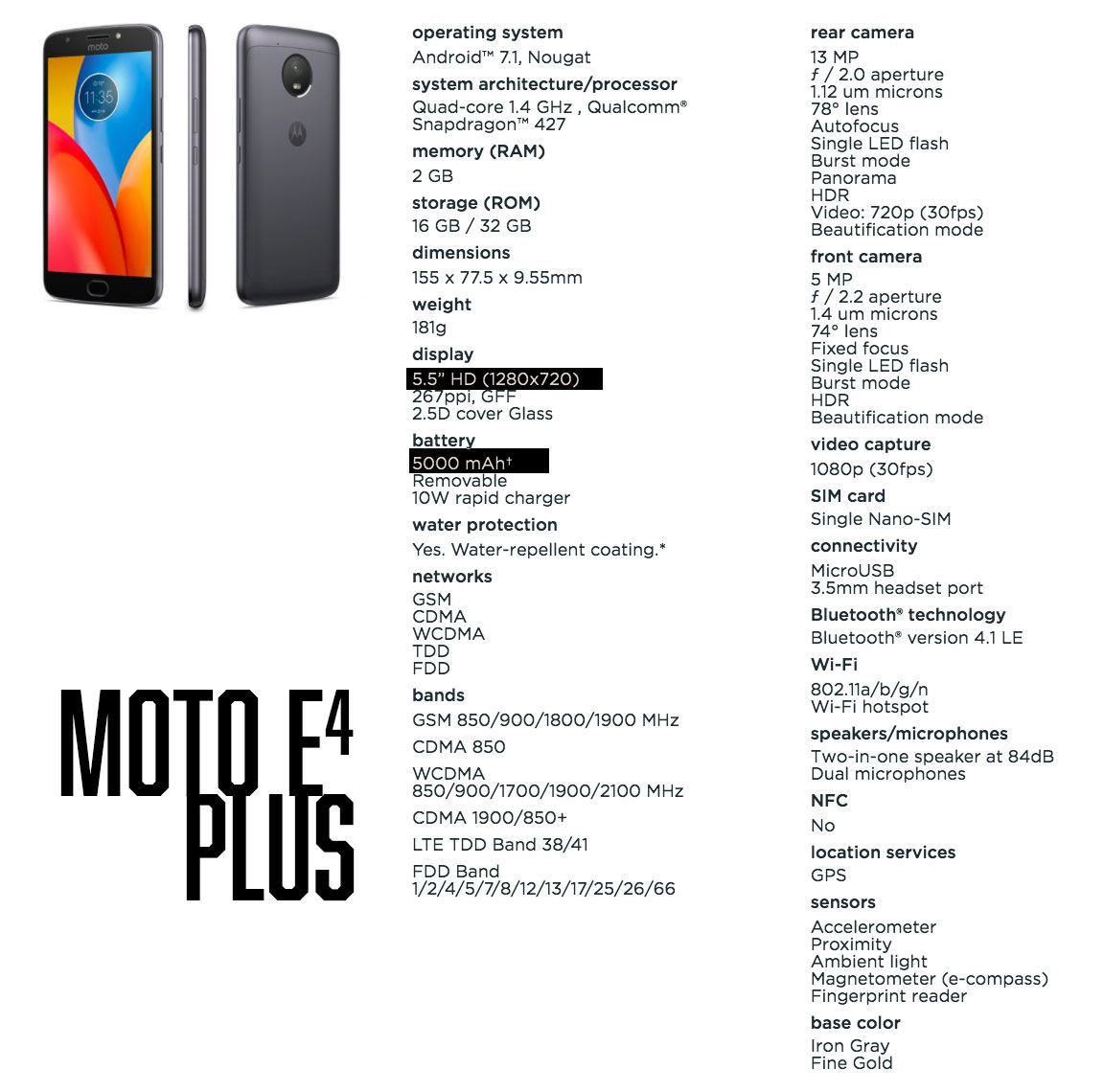 โดย Moto E4 นั้นจะได้หน้าจอขนาด 5 นิ้วพร้อมกับ ความละเอียดหน้าจอ HD, พร้อมกับแบตเตอรี่ในตัว 2800 mAh ใช้ขุมพลัง Qualcomm Snapdragon Quad Core 1.4GHz, RAM 2GB, ความจำในตัว 16GB เรียกได้ว่าใกล้กับ Moto C