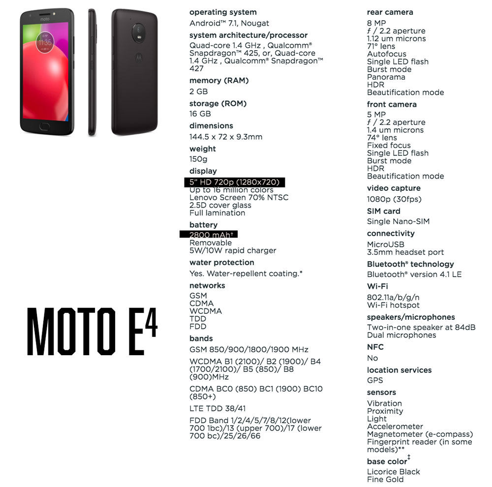 โดย Moto E4 นั้นจะได้หน้าจอขนาด 5 นิ้วพร้อมกับ ความละเอียดหน้าจอ HD, พร้อมกับแบตเตอรี่ในตัว 2800 mAh ใช้ขุมพลัง Qualcomm Snapdragon Quad Core 1.4GHz, RAM 2GB, ความจำในตัว 16GB เรียกได้ว่าใกล้กับ Moto C