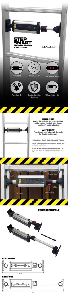 ตัวเครื่องมีความแข็งแรงทนทาน ทำมาจากวัสดุที่เป็นอะลูมิเนียม ภายในมีแบตเตอรี่ในตัวสามารถใช้งานได้ยาว 70 ชั่วโมง วิธีใช้งานก็คือนำไปติดกับตัวบันได โดยมันสามารถยืดหดได้ทำให้ใช้กับบันไดได้หลายขนาด เมื่อเรานำบันไดไปพาดกับที่ที่ต้องการ จากนั้นก็กดปุ่มเริ่มทำงาน ตัวไฟ LED จะแสดงสถานะให้เรารู้ว่าเราวางได้ระนาบมั่นคงรึเปล่า ถ้ามั่นคงไฟสีเขียวก็จะติดขึ้น ถ้าไม่ได้ระนาบไฟสีแดงก็จะติดขึ้นแทน ที่มันฉลาดขนาดนี้เพราะภายในติดตั้งเซนเซอร์จับการเปลี่ยนแปลงของตำแหน่งบันได