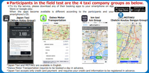 ผู้ให้บริการแท็กซี่ที่เข้ารวมก็มีทั้ง Japan Taxi, Motaku, Daiwa Motor และ, km Taxi ซึ่งเราสามารถโหลดแอปของแต่ละค่ายมาใช้งานได้จาก App Store และ Google Play ซึ่งแอปของ Japan Taxi และ Motaku นั้นจะรองรับภาษาอังกฤษด้วย ในช่วงแรกนั้นจะรองรับการเรียกรถในเมืองใหญ่ๆก่อน เช่น ในโตเกียวจะรองรับ 23 เขตหลัก