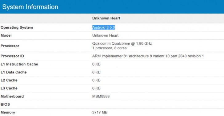 โดยรหัสการพัฒนานั้นยังคงเป็น Unknow Heart พร้อมกับใช้ CPU Qualcomm Snapdragon 835, RAM 4GB ความจำ 64GB แต่ระบบปฏิบัติการ ใช้ Android 8.0.0