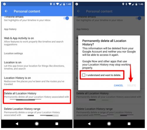 นอกจากนั้นเรายังสามารถลบ Location History ได้ด้วย โดยจะลบทั้งหมดหรือเป็นช่วงๆก็ได้ วิธีทำคือใหเข้าไปที่หน้าการตั้งค่าเลือก Personal Content เลื่อนมาด้านด้านล่างเราจะเห็นตัวเลือก “Delete Location History Range” และ “Delete all Location History” ก่อนลบก็จะมีคำเตือนเด้งขึ้นมาเพื่อถามให้แน่ใจว่าคุณต้องการลบข้อมูลจริงๆ