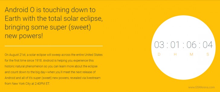 โดยคาดว่าจะมีการ Live ผ่านเว็บไซต์ของ Android.com ในเวลา 2:30 PM จากที่ New York ส่วนชื่อนั้นมีหลายคนคาเดากันว่าจะใช้ชื่อ Oreo ซึ่งถ้าเป็นเช่นนั้นจริงเท่ากับ มีการใช้ชื่อเดียวกับขนมของเนสเลย์ มาตั้งแต่รุ่น Android Kitkat (4.4) เพราะคำใบที่ว่า solar eclipse นั้นมันก็มหายถึงสีดำเป็นวงกลมซึ่งตรงกับ Oreo ทุกประการ ซึ่งชื่อนี้มีความเป็นไปได้สูงมาก เมื่อ Android Police ได้เห็นชื่อไฟล์วิดีโอที่ทางกูเกิลโพสต์ลงใน Google+ แต่ล่าสุดได้โดนลบออกไปแล้ว คลิปนี้เป็นทีเซอร์ประกาศวันเปิดตัวนั่นเอง