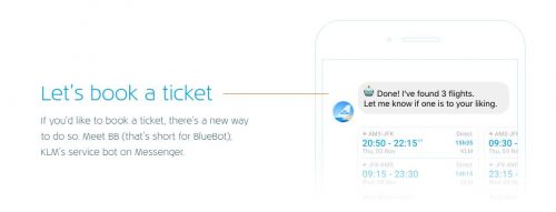 สายการบิน เคแอลเอ็ม รอยัลดัตช์ แอร์ไลน์ หรือ KLM ประกาศเปิดตัวบริการใหม่เพื่ออำนวยความสะดวกให้แก่ผู้โดยสารของสายการบิน โดยสามารถทำการจองตั๋วโดยสารได้เองผ่านแอพพลิเคชั่น Messenger ของ KLM ที่เรียกว่า BlueBot (BB) ที่สนับสนุนด้วยเทคโนโลยีสุดล้ำของระบบ AI โดย BB นี้มีหน้าที่ให้บริการแก่ลูกค้าของสายการบินในการรับสั่งจองตั๋วการเดินทางผ่านแอพพลิเคชั่น Messenger ด้วยการสนทนาแบบธรรมดาเหมือนติดต่อกับเจ้าหน้าที่ปกติ จากการนำเอาเทคโนโลยี AI มาใช้นี้ช่วยให้ลูกค้าของสายการบินสามารถจองตั๋วได้ง่ายขึ้น ไม่จำเป็นต้องรอติดต่อกับเจ้าหน้าที่ของทางสายการบิน KLM อีกต่อไป