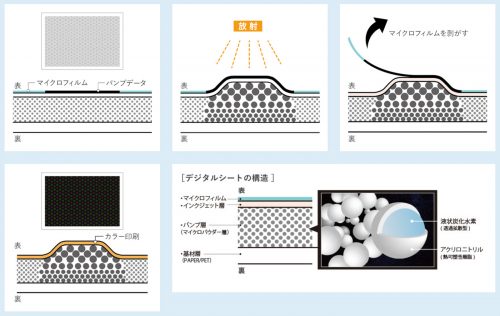 เพื่อควบคุมผิวสัมผัสให้เหมือนจริงที่สุด ในการพิมพ์รอบแรกนั้นจะทำบนชั้น microfilm ที่อยู่บนสุดด้วยคาร์บอน จากนั้นอนุภาคคาร์บอนจะคอยดูดซับความร้อนในพื้นที่ที่ต้องการสร้างลวดลายขึ้นมา ปัจจุบันแผ่นนี้สามารถนูนขึ้นมาได้ดีที่สุดที่ 1.7 มิลลิเมตรที่จะเห็นลวดลายเด่นชัดที่สุด แต่ในเชิงเทคนิคนั้นสามารถทำให้นูนขึ้นได้ถึง 2 -2.5 มม. ส่วนกระดาษที่ดึงชั้นไมโครฟิล์มด้านนอกออกมาแล้วสามารถนำไปพิมพ์ต่อด้วยเครื่อง Injet ธรรมดาได้อีก