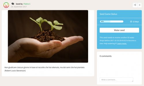ถ้าหากในหนึ่งสัปดาห์เมล็ดของคุณได้รับการดน้ำครบ 100 ครั้งก็จะงอกเป็นต้นอ่อน พร้อมกับเมล็ดพันธ์ุใหม่ให้คุณใช้ปลูกต้นต่อไป เพื่อเป็นการดึงให้คนมาช่วยรดน้ำ ทางเว็บก็จะกำหนดเงื่อนไขว่าถ้าหากต้นไม้เติบโตได้สำเร็จก็จะต้องทำการปลูกต้นไม้จริงหนึ่งต้น โดยจะมีรายละเอียดบอกไว้ด้านล่างว่าจะปลูกต้นอะไรที่ไหน มันช่วยลดโลกร้อนได้เท่าไหร่