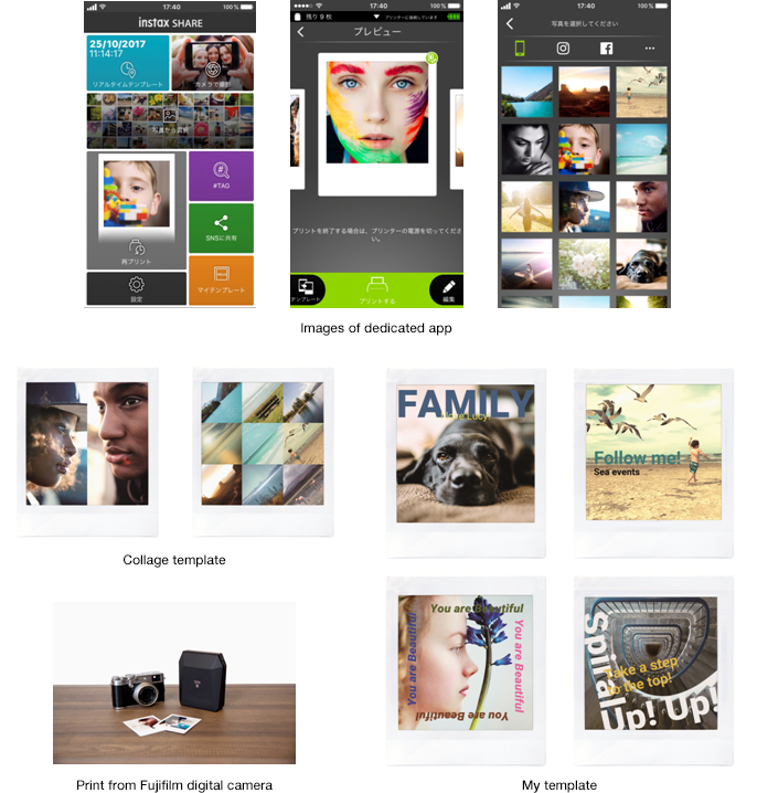 ส่วนลูกเล่นที่เพิ่มเข้ามานั้นอยู่ในส่วยของ Application ที่สามารถตกแต่งภาพได้มากกว่าเดิม เช่นการตกแต่งสีภาพ, รวมภาพได้ทั้งหมด 9 ภาพในรูปเดียว ใส่ภาพอากาศ หรือ วันเวลาได้เช่นเคย และยังแยกภาพได้ว่าอันไหนจากในกล้อง หรือต่อกับ Instax Camera บางรุ่นที่สามารถได้เช่นกัน