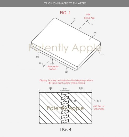 สิทธิบัตินี้ระบุว่าการพับนั้นจะเปิดปิดเหมือนสมุด โดยจอนั้นอาจจะเป็นจอ LCD,OLED หรือ microLED ก็ได้ คาดกันว่า Apple จะเปิดตัวสมาร์ทโฟนจอพับได้นั้นจะเปิดตัวในปี 2021 เมื่อถึงเวลานั้นแอปเปิ้ลจะเปลี่ยนไปใช้จอ microLED แทน ซึ่งมันมีคุณสมบัติของจอ OLED ครบถ้วน แต่ความสว่าง, ความอิ่มตัวของสีและการประหยัดพลังงานจะทำได้ดีกว่า