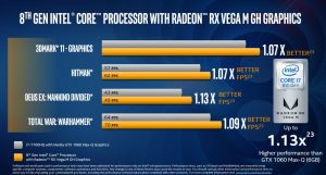 ส่วนแล็ปท็อปที่ใช้ RX Vega M GL จะทำงานได้เร็วกว่า NVIDIA’s GTX 1050 ถึง 1.4 เท่าเมื่อใช้เล่นเกม Hitman ส่วน GH นั้นจะทำงานได้เร็วขึ้น 10% กว่า NVIDIA GTX 1060 ที่ใช้ CPU รุ่นที่ 7 นั่นหมายความว่าเมื่อใช้เล่นเกมใหม่ๆนั้นจะเห็นภาพที่ลื่นไหลขึ้นที่ 60 เฟรมต่อวินาทีที่ความละเอียด 1080p ซึ่งปกติแล้วเราต้องใช้ GPU แยก