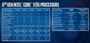 อินเทลจะมี 2 รุ่นให้เลือกคือ RX Vega M GL สำหรับแล็ปท็อปและ GH สำหรับคอมพิวเตอร์ desktop โดยรุ่น GL นั้นจะมีความเร็วและประมวลผลด้านกราฟฟิคน้อยกว่าเพราะต้องคำนึงถึงเรื่องการประหยัดไฟด้วย ความเร็วของรุ่น GL จะอยู่ที่ 931MHz และ 1,011MHz โดยจะมีให้เลือกทั้ง Core i5 และ i7 ส่วน GH จะมีความเร็ว 1,063MHz และ 1,190MHz มีเฉพาะ Core i7 เท่านั้น