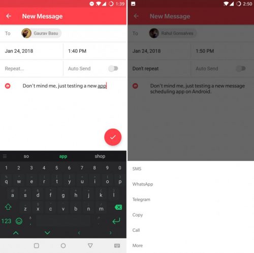 แอปนี้มีเฉพาะบน Android การใช้งานไม่ได้ยุ่งยากอะไร เราเพียงแค่พิมพ์ข้อความที่ต้องการหรือใส่ภาพเข้าไปด้วยก็ได้ จากนั้นก็เลือกรายชื่อผู้รับจากรายชื่อติดต่อในเครื่องของเรา แล้วเลือกเวลาที่ต้องการส่ง ตัวแอปจะมีสองทางเลือกให้คือส่งให้อัตโนมัติตามเวลาที่ตั้งไว้ผ่าน SMS หรือแอปแชทอื่นๆ