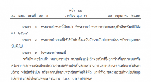 เว็บไซต์ราชกิจจานุเบกษาได้ประกาศเนื้อหา พรก.การประกอบธุรกิจสินทรัพย์ดิจิทัล ถือเป็นกฎหมายฉบับแรกของไทยที่เกี่ยวกับเงินดิจิทัล มีผลบังคับใช้ 14 พฤษภาคมนี้