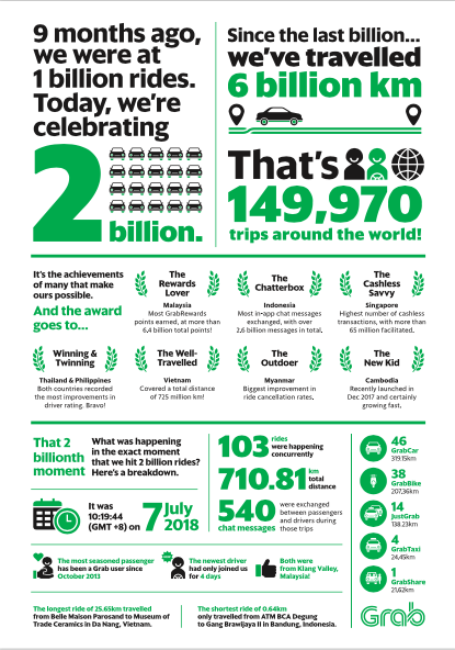 - แกร็บ ฉลองครบรอบการบริการครบ 2 พันล้านเที่ยวในวันที่ 7 กรกฎาคม 2561 โดยก่อนหน้านี้ แกร็บใช้เวลาถึง 5 ปี 4 เดือนในการให้บริการครบ 1 พันล้านแรก แต่ใช้เวลาเพียงแค่น้อยกว่า 9 เดือนในการให้บริการครบรอบอีกพันล้านถัดมา