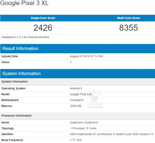 ถ้าหากผลการทดสอบนี้เป็นของจริง Google Pixel 3 จะมาพร้อมกับชิป Snapdragon 845 ของ Qualcomm ซึ่งเรียกว่าเป็นชิปที่นิยมใช้ในสมาร์ทโฟนเรือธงหลายรุ่นของปี 2018 ส่วน RAM นั้นดูเหมือนว่าจะให้มาน้อยไปสักนิดนึงอยู่ที่ 4GB ซึ่งน่าแปลกใจเพราะเรือธงของแอนดรอยด์หลายรุ่นนั้นขยับขึ้นไปเป็น 6GB แล้ว อันนี้ก็ต้องมารอดูว่าจะมีรุ่นย่อยที่สเปคสูงขึ้นรึเปล่า