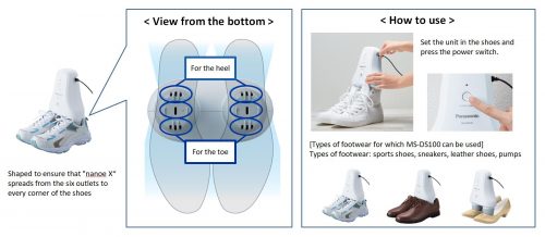 เครื่องนี้มีชื่อว่า MS-DS100 เป็นอุปกรณ์อิเลคทรอนิกส์ที่สร้างอนุภาคขนาดเล็กด้วยเทคโนโลยี nanoe X ซึ่งมันเล็กกว่าละอองไอน้ำซะอีกเพื่อกำจัดกลิ่นไม่พึงประสงค์ เพียงแค่เสียลงลงไปในรองเท้ามันก็จะสร้างอนุภาคนี้กระจายไปทั่วทุกซอกทุกมุม รวมถึงในเนื้อผ้า นอกจากกลิ่นแล้วก็ยังยับยั้งแบคทีเรียที่อยู่บนผิวหน้าของรองเท้าได้ด้วย แต่ข้อจำกัดก็คือ กระบวนการทำความสะอาดนั้นต้องใช้เวลาซึ่งเราต้องเสียบทิ้งไว้ 5-7 ชั่วโมงขึ้นอยู่กับความแรงของกลิ่น