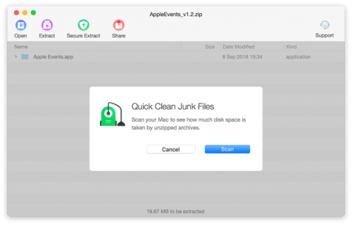 กระบวนการเก็บข้อมูลนั้นจะเริ่มตั้งแต่ตอนเปิดแอป จากนั้นมันก็จะสร้างไฟล์ ZIP ส่งกลับไป เมื่อทดลองใช้งานแอป Dr. Unarchiver แอปเอาไว้ใช้แตกไฟล์ ZIP นั้น จะมีฟีเจอร์ “Quick Clean Junk Files” ซึ่งจะเป็นตัวที่เอาไว้ใช้เข้าถึง home directory ในเครื่องเรานั่นเอง