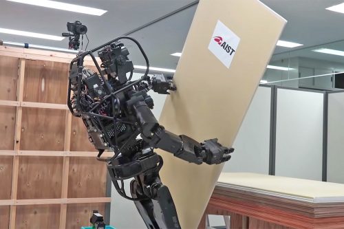 นักวิจัยญี่ปุ่นได้สร้างหุ่นยนต์ฮิวแมนนอยด์ชื่อว่า HRP-5P สำหรับแก้ปัญหาเรื่องแรงงานก่อสร้างขาดแคลน รวมถึงใช้งานในสถานการณ์ที่เสี่ยงอันตรายกับคน ตัวหุ่นยนต์ต้นแบบนั้นใช้สารพัดเทคโนโลยีเพื่อตรวจจับสภาพแวดล้อมในการทำงาน ตรวจจับวัตถุที่อยู่รอบตัว จากนั้นก็จะนำข้อมูลทั้งหมดมาวางแผนการติดตั้งกำแพงให้เสร็จสมบูรณ์ ด้วยการยกฝ้ากำแพงไปติดกับโครงไม้ จากนั้นก็ยิงน็อตเพื่อติดตั้ง
