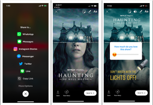 จากนั้นจัดการแชร์เป็นอินสตาแกรมสตอรี่หรือส่งเป็นไดเร็กเมสเซจหาเพื่อนคนเดียวหรือส่งให้เพื่อนทั้งแก็งค์ก็ได้อีกด้วย โดยปกภาพยนตร์ที่แชร์จะปรากฏอยู่ 24 ชั่วโมง และยังสามารถเข้าสู่ลิงก์เพื่อเข้าไปเลือกชมภาพยนตร์หรือซีรี่ส์นั้นๆ บนแอปพลิเคชันชมภาพยนตร์ของเน็ตฟลิกซ์ได้อีกด้วย