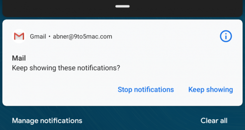 Android Q มาพร้อมตัวเลือกเพิ่มเติมในการจัดการการแจ้งเตือนมากขึ้น เราสามารถหยุดการแจ้งเตือนหรือให้เตือนต่อไปได้ทันที ถ้าอยากเข้าถึงคำสั่งที่เยอะขึ้น เราจะเห็นคำสั่งจัดการในกรอบตรงมุมซ้ายล่าง นอกจากนั้นเรายังเห็นตัวเลือกในการแสดงผลตามลำดับความสำคัญในแถบแสดงสถานะ
