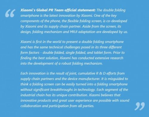 Xiaomi ได้ออกแถลงการณ์ บอกเล่าถึงสมาร์ทโฟนจอพับได้และเบื้องหลังการพัฒนา, การออกแบบและความท้าทายในการเอาชนะอุปสรรคต่างๆของจอพับได้และกลไกการพับเพื่อทำให้ระบบปฏิบัติการ MIUI สามารถตอบสนองต่อการพับในรูปแบบต่างๆได้ รวมถึงอธิบายถึงการร่วมมือกับพันธมิตรในการพัฒนาสมาร์ทโฟนด้วยกัน โดยสามารถพับใช้งานได้ 3 รูปแบบด้วยกันคือ โหมดแท็ปเล็ต, Single Folded และ Double Folded