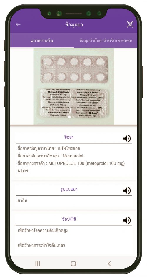 - แสดงคิวเจาะเลือดและรับยา/ ค้นหา/ บันทึกข้อมูลยา (Rational Drug Use) ผู้ใช้บริการสามารถเช็คคิวเจาะเลือดและรับยาผ่านแอปฯ และเมื่อสแกนคิวอาร์โค้ดที่หน้าซองยา ก็จะสามารถตรวจสอบและบันทึกข้อมูลยาของตนเอง ว่าเคยได้รับยาอะไรบ้าง ไว้เป็นข้อมูลเพื่อใช้ยาได้อย่างถูกต้อง เหมาะสม และปลอดภัยยิ่งขึ้น